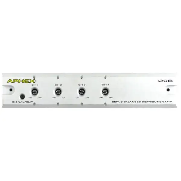 The Aphex 120B is a high performance audio distribution amplifier with a single high impedance input and four low impedance outputs, all electronically servo-balanced and designed to be as transparent as possible. The 120’s transformerless circuits are designed for wide, flat frequency response, free from ringing or overshoot, making it ideal for distribution of time code or audio. Each output has its own amplifier and level control for maximum versatility and isolation. The sturdy steel chassis may be used stand-alone or rackmounted, singly or in pairs.