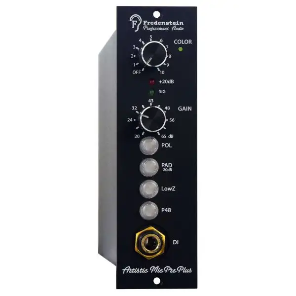 The Fredenstein Artistic MicPre Plus features a revolutionary tube type distortion circuit. The variable color control allows to adjust this feature from very subtle to extremely pronounced. In addition, the Color feature is also level dependent in the same way tube gear behaves. Variable color enables a myriad of new creative possibilities and prevents cold and stale sounds. Turning the Color knob all the way counter clockwise, the Color LED turns off and the Color circuit is completely disabled.