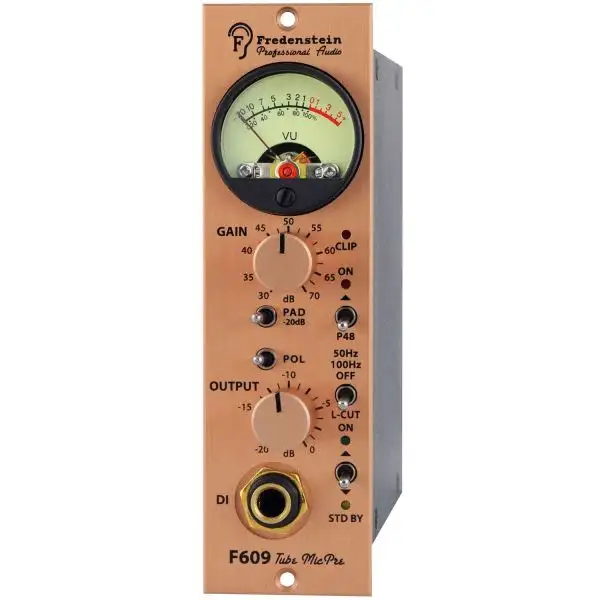 The Fredenstein F609 is a professional tube microphone preamplifier, using two double-triodes, one ECC802S (12AU7) and one ECC803S (12AX7), in a single 500 series rack module. It provides an +160V power-supply to avoid starving the tubes. The F609 uses high quality American made input and output transformers.