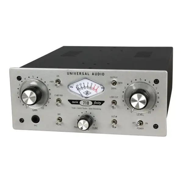 The Universal Audio 710 Twin-Finity is a radically new UA pre-amp design which uniquely combines both the classic retro warmth of UA tube design and the transient bite of solid-state in a 2U, half-rack, all-metal chassis. The 710 was created specifically to add the tonal versatility and sonic inspiration missing from generic audio interface preamps.